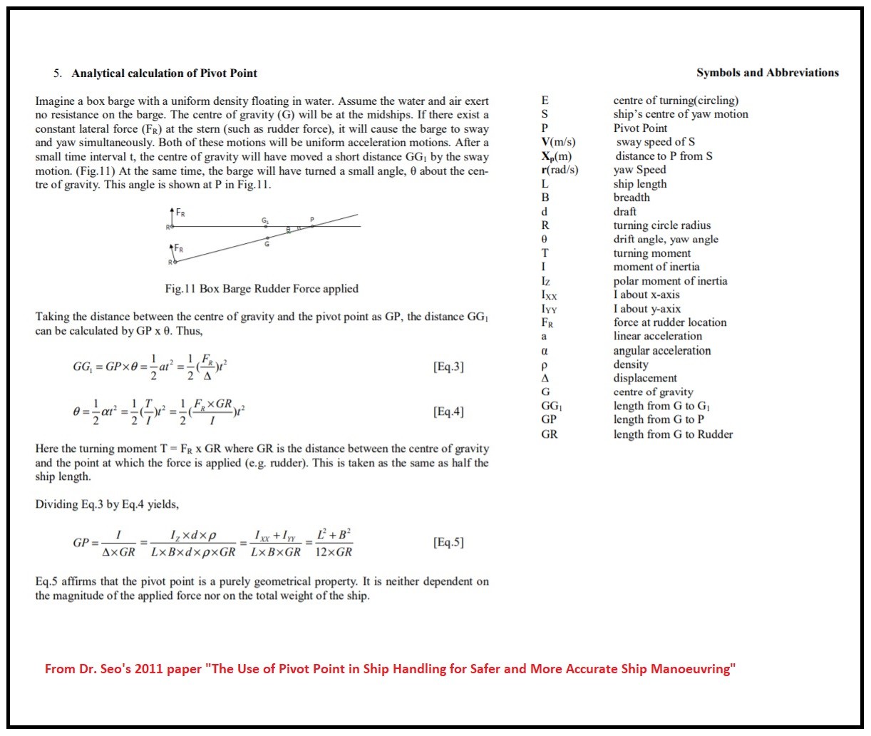“The size of ships has increased notably over the recent decades. The size of harbours and ports has however not grown in proportion. As a result ship manoeuvring in harbours and ports has become more problematic…the pivot point concept can be useful in analysing slow ship manoeuvring [and now]… many practitioners now routinely plan confined manoeuvring using the [traditional] ‘pivot point’ concept. [However], the concept has been defined in a number of contradictory and inaccurate ways leading to confusion and mystification … many practitioners and trainers often rely on intuition to bridge the gap between reality and their flawed understanding of theory…[this paper] will correct definitions put forward and [apply it] to basic and ‘special’ ship manoeuvres.” Dr. Seong-Gi Seo, October 2011.