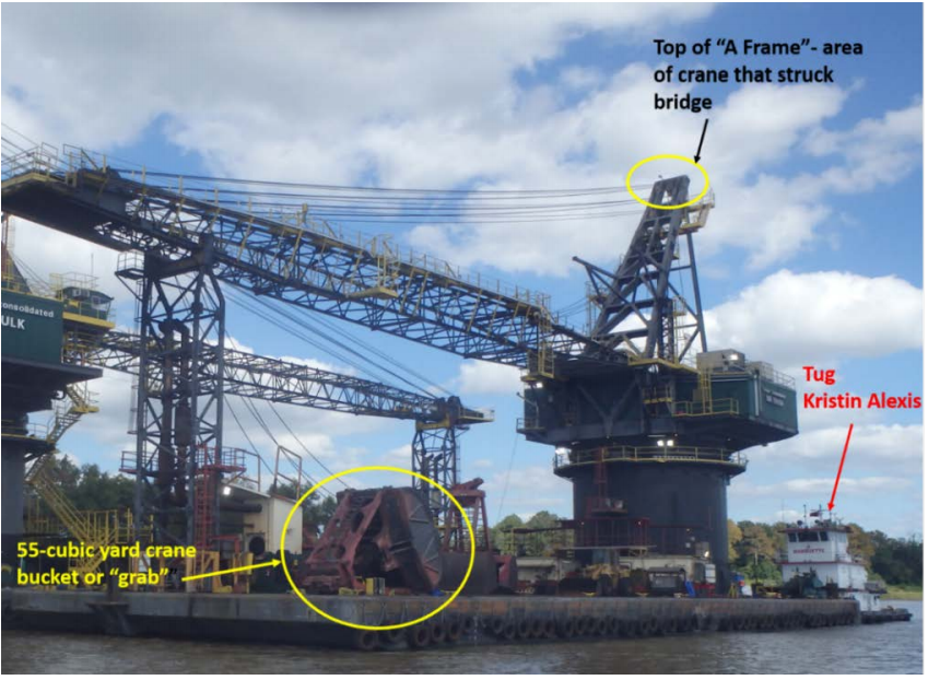 On October 11, 2018, the Kristin Alexis was performing fleeting work with a crew of six, including a captain, pilot, and four deckhands (two per shift), at the Cooper Consolidated fleeting facility at Convent located at mile 161.5. About 2300, the Cooper Consolidated dispatcher informed the Kristin Alexis captain that their next job was to move the derrick-type crane barge Mr Ervin upriver to the Cooper Consolidated fleeting facility in Darrow, located at mile 175.