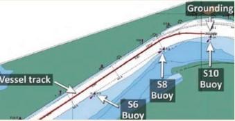 At 2153:20 the vessel’s speed was near 14 knots and the rate of turn was about 25 degrees/minute to starboard. About a minute later, with the speed now 13 knots, the pilot cross-checked information from the PPU predictor with the radar. The radar information showed the vessel was not proceeding as indicated on the PPU so he ordered counter rudder to port and full ahead on the engine to stop the turn to starboard and correct the vessel’s position in the channel. This action was insufficient and the vessel grounded at 2156, within the navigable channel but in an area where silting had been reported and that the pilot knew was present. With the rising tide the team were able to re-float and dock the vessel about two hours later.