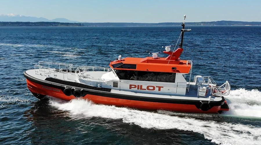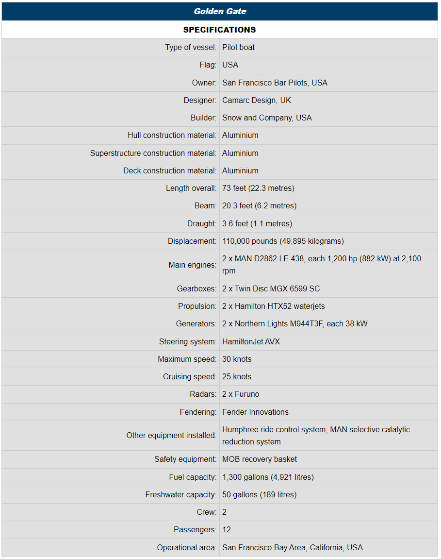 The new boat has an LOA of 73 feet (22.3 metres), a beam of 20.3 feet (6.2 metres), a maximum draught of just over 3.6 feet (1.1 metres), and space for two crewmembers and up to 12 pilots/passengers. The propulsion system consists of two MAN D2862 LE 438 1,200hp (882kW) US EPA Tier IV-compliant main engines driving Hamilton HTX52 waterjets via Twin Disc MGX 6599 SC gearboxes to deliver a speed of over 30 knots. A Humphree active ride control system optimises trim and reduces motions at speed.