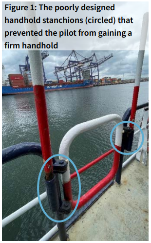 Text and pictures by MAIB, UK - Published 17 July 2023Just over half of these were reported to the MAIB, the most serious of which resulted in the pilot suffering a fractured ankle when they lost their grip on the handhold stanchion and fell 3 metres onto the pilot boat. The preliminary assessment found that the vessel’s handhold stanchions were not fit for purpose, as heir design prevented the pilot gaining a firm grasp as they reached the top of the ladder (Figure 1).
