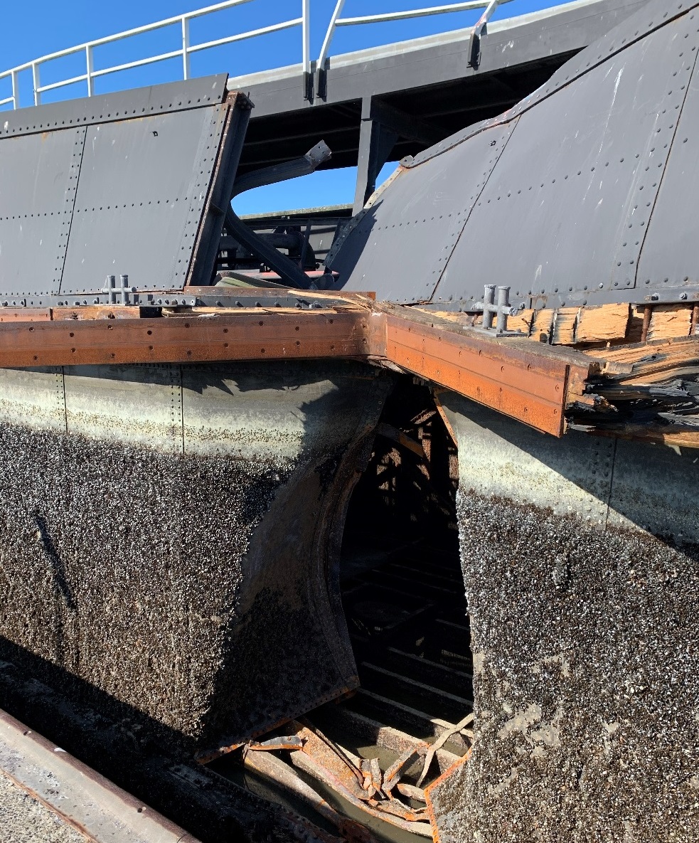The damaged gate is removed, replaced by a spare gate and swum out to the repair site. There the damage will be further examined.